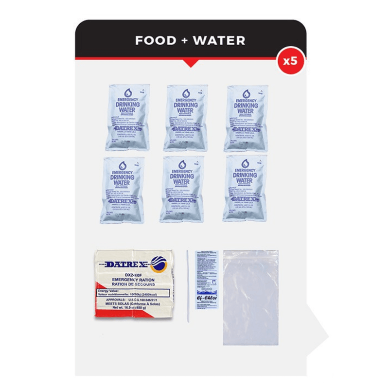 Food and Water: The food and water in this kit have a 5-year shelf life, and are meant to provide nutrition for 72 hours.