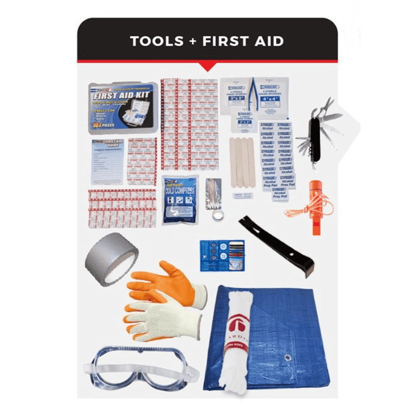 Tools and First Aid: These tools can be useful when you need help with navigation, transport, personal protection, or shelter. A first aid kit can be used to treat minor injuries and protect against more serious health threats in a disaster.